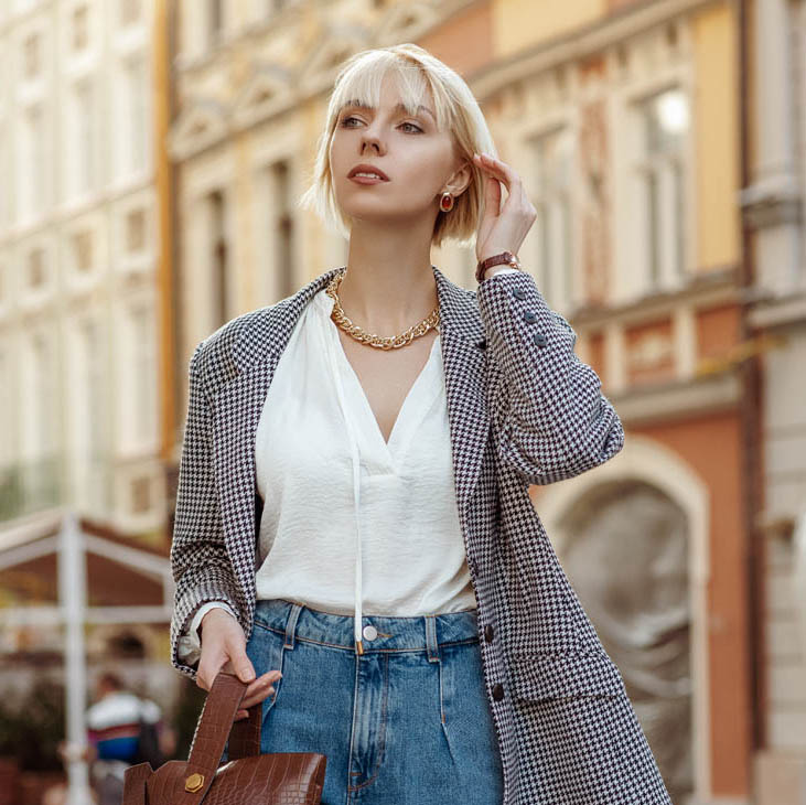 Street fashion photo of elegant woman wearing trendy white blouse, stylish checkered blazer, high waist jeans, holding brown faux croco leather textured bag. Model walking in street of European city
